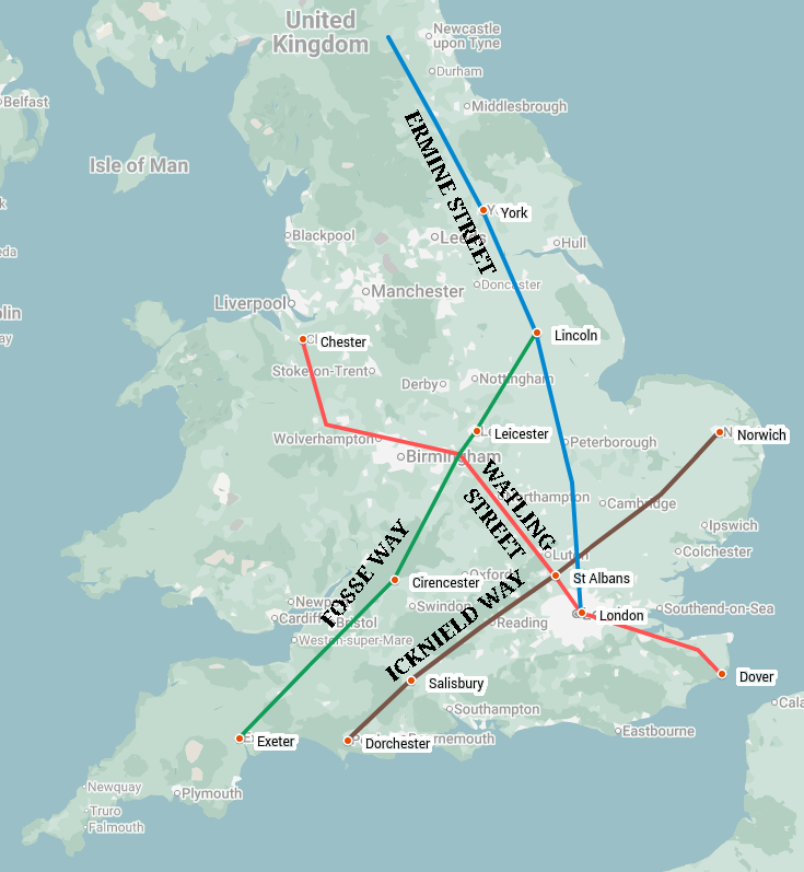 The Roman occupation of Britain brought with it the masculine engineering of the Roman Road. In the main unfazed by nature, Legions constructed the famous straight-line military roads across the English and Welsh landscape, ploughing through field and forest and river. This was a system of civil engineering not seen again until the United States' "road first, town later" mentality. Roman forts and cities were built where the roads intersected, rather than the roads being built between existing settlements. This unnatural system forced the structure of British civilisation to conform to it by strength of arms, and the effects of this project are evident in even modern population distribution. At the core of the Roman system were three roads: Watling Street from Dover to Chester via London; Ermine Street from London to York (and beyond) via Lincoln; and the Fosse Way from Lincoln to Exeter. These three roads made up an efficient system of connections allowing Roman Legions to get from their bases to anywhere in the country as efficiently as possible. However even these new Roman highways weren't built in a vacuum. The City of St Albans, for example, was a nexus for roads in Roman Britain, with Watling Street and Akeman Street (London-Cirencester) passing through. Also passing East-West through the city is the mysterious "Icknield Way", potentially the oldest known long-distance route in Britain. Icknield Way is attested for by Caesar as a primary artery of the Bretons, following a near-straight course from Norwich through Bury St Edmunds and St Albans to Old Salisbury and the Dorset Coast. This general route (the exact course of which probably shifted over the centuries) seems to be the most active axis across which Preroman Britain operated: along this line were found the most powerful tribes of the era, and are many of the most ancient sites in England such as Stonehenge. It matches up somewhat with "St Michael's Alignment", as I explored in my article from June too. These Roman Roads were truly fearsome feats, not many structures last 2000 years, and fewer still can remain useful in their original purpose for that long too. The routes of these roads are so integral to Britain that they number alongside rivers and mountains in our demarcations of land. Take my home county of Warwickshire, for example. Her borders are marked by natural features: the ridge of the Cotswold Hills, the course of the River Avon, and the entrenched straight-line of Watling Street.