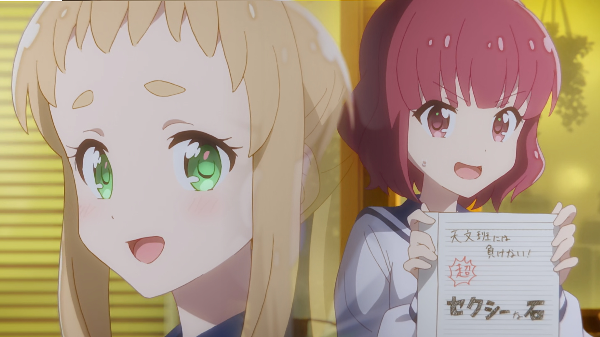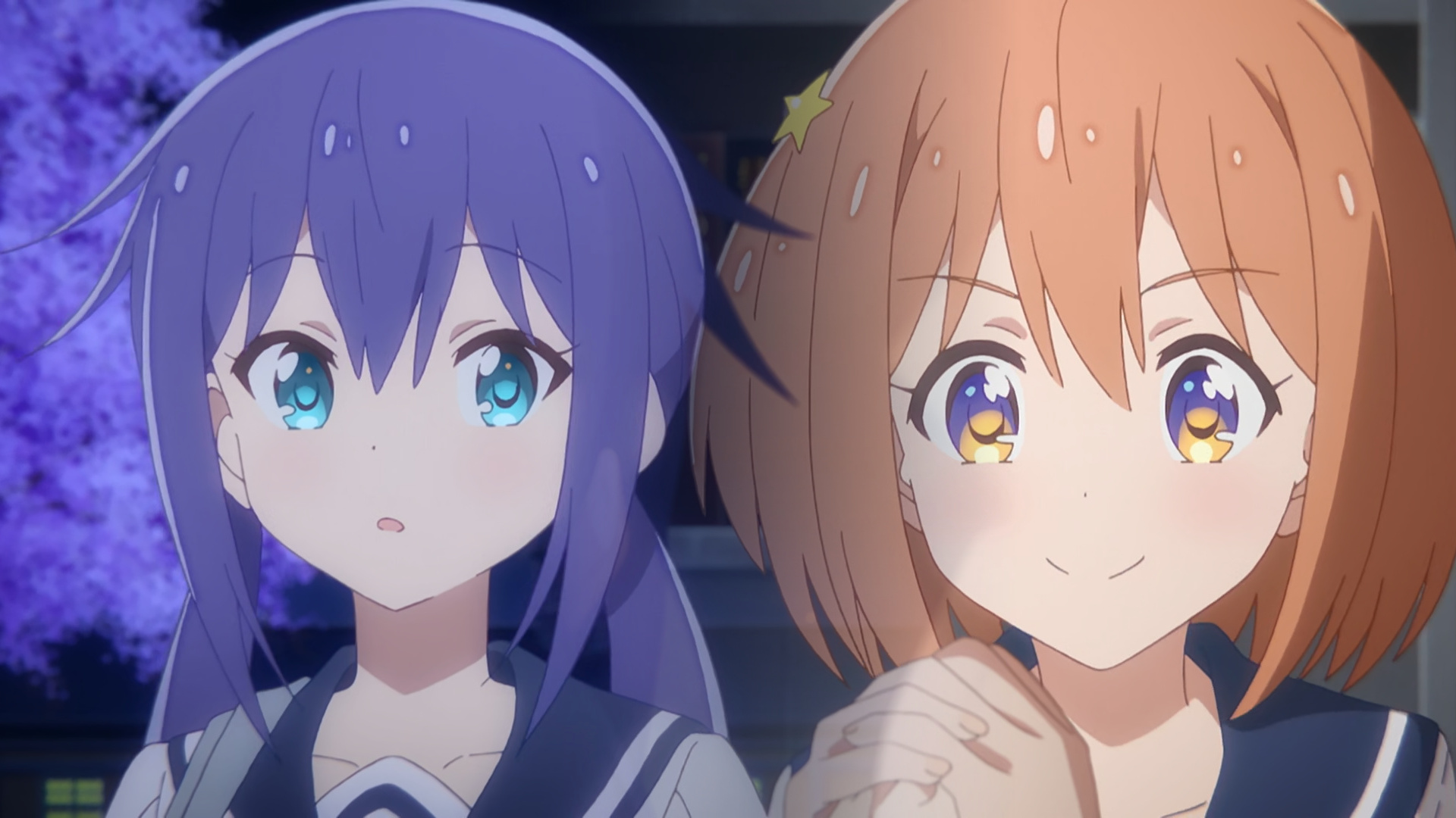 First is the protagonist, Mira. Her genki enthusiasm for astronomy drives her character, she is a person driven by passion rather than analysis. Her love of stargazing is mostly aesthetic and her knowledge of the subject is small (for now), but the emotions she feels towards it are stronger than the more analytically inclined can muster. Her eyes are the most striking in the show, befitting of the main character. They depict the moment of the appearance of the first star over a sunset in a darkening sky, a moment of mystery and wonder. Immediately captivating but not complex, this is contrasted with her bashful counterpart, Ao.