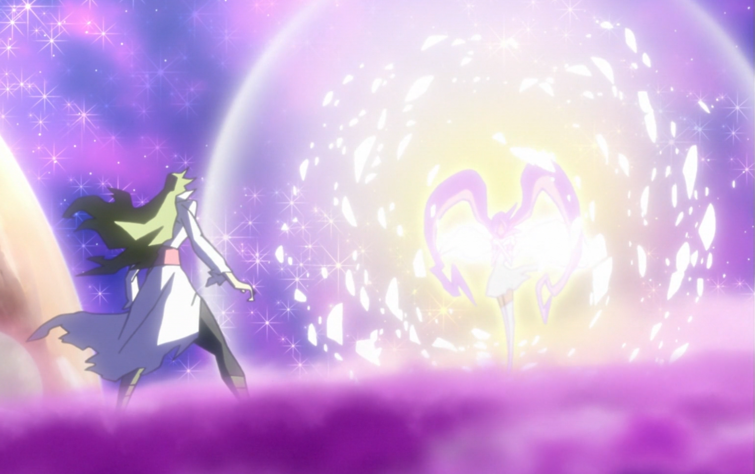 ^ Unity and Divinity: the girls have merged into one being of 'infinite power, infinite love and eyes full of stars' to defeat the big bad in the Gurren Lagann-esque finale of Heartcatch Precure.