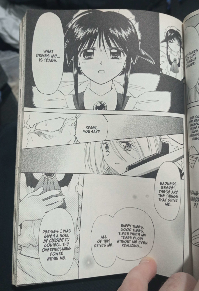 To finish off let's return to maids. Mahoro is evidentially Mahoromatic's stand-in for the perfect human: omnipotent, omnibenevolent, (sort of) omniscient; a god if you will. But she is the natural conclusion of extrapolating the essence of a "maid". A maid is meant to be a glimpse at feminine perfection: a beautiful virgin bound to serve her master or mistress. Ever elegant, without blemish or cracks in her facade. In a society obsessed with etiquette such as early-modern England, the maid was meant to be the epitome of such social values: it was the aristocrats vision of power. Which is why in their modern incarnations, maids have seamlessly flowed into the roles of a physically strong protector or an object of sexual fantasy. Whatever you value, be it social standing, physical strength or sexual attractiveness, your maid should be the perfect reflection of that value, and because she is stronger than you, she must serve you. Wodehouse understood this dynamic too through the relationship of the impeccable Jeeves and the hopeless Wooster. And so this is why Mahoro is "the maid who runs off tears", as the perfect being she is driven by sympathy: the woes and joys of mankind are her motivators as our servant and ultimate saviour.
