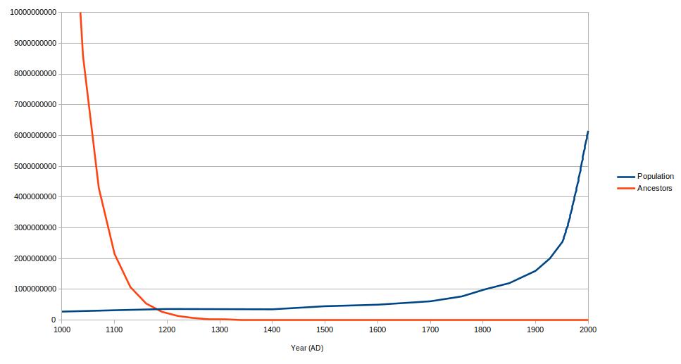 Occasionally commoners (usually American) boast of having traced their ancestry back to such figures as Charlemagne, but genealogical scholars estimate that almost everyone of European heritage descends directly from one of Charlemagne's close retainers (>99%), with an estimated 90% being directly descended from the Emperor himself. This tracks with my graph above, with Charlemagne living a few centuries before that explosion of potential ancestors. So while discovering your descent from him is surely a commendable achievement, it is nothing out of the ordinary. In fact it is very likely that almost everyone of European descent is descended from the vast majority of everyone who lived and bred in Europe at that time, and at any time before. You are, for example, most certainly descended from basically every citizen of Rome from Romulus to Odoacer.