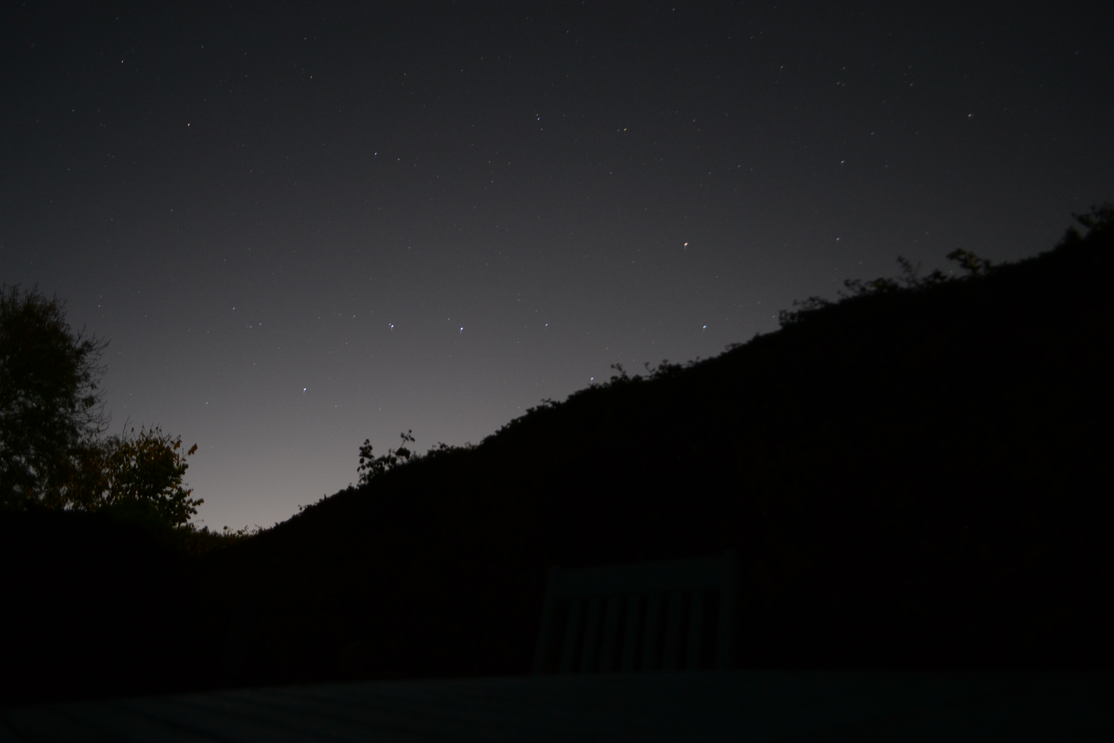 Finally is night photography, which is really a meta-category. Night photography is just taking photos in low-light, whether than be landscape, portrait or even macro. Obviously the trick here is to let in as much light as possible into the camera without compromising on all the other aspects of the photo. It's really hard. Even light levels our eyes easily adjust too like inside on a cloudy afternoon will severely curtail your image quality if you don't compensate with the various settings available. This is where ISO really comes into play, and its an area where I still have a long way to go to take anything decent. On the extreme end of night photography is astrophotography: taking pictures of the night sky. Basically you need a really high ISO and a really long shutter speed (often in the minutes long), I did try my hand at it one night, but every image I took just came up black except for this one.