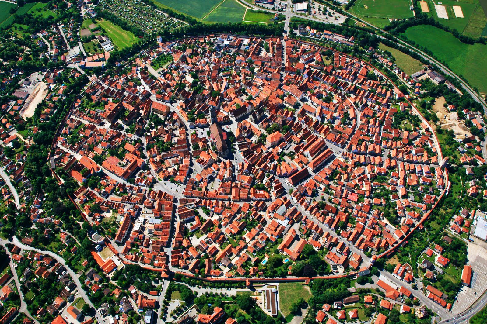 A real-world example of this "evil metromandala" could be that of Nordlingen [9]. The old town of Nordlingen was built in a previously mysterious perfectly circular and concentric set of indentations in the world, the extent of which can be viewed from space. Built in the very centre, the town was built from a magical sparkling rock, mined from the area in the centre. Later excavations revealed that this mega-earthwork was the work of an ancient asteroid striking the earth leaving the geology we find today as well as hundreds of thousands of micro-diamonds, which were responsible for the characteristic sparkling stone. The city was built upon the remains of a celestial missile and there is evidence of settlement in the crater going back ten thousand years.