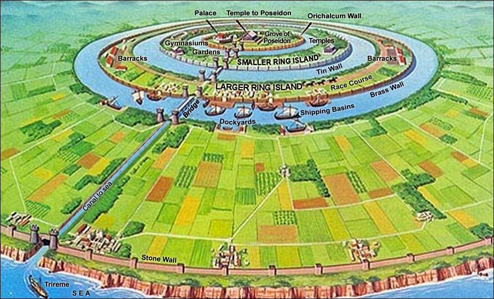 While in real life, our cities will always be humanly lopsided and imperfect, in fiction and in theory, the design of perfect cities as reflections of a perfect society hearken from time immemorial. In Plato's Critias [17], he tells tales of the lost city of Atlantis, a city of perfection and of utopia. He describes the city within as a city of concentric islands, each one built according to his strict class-structure, and the fascination point being the grand temple of Poseidon in the centre.
