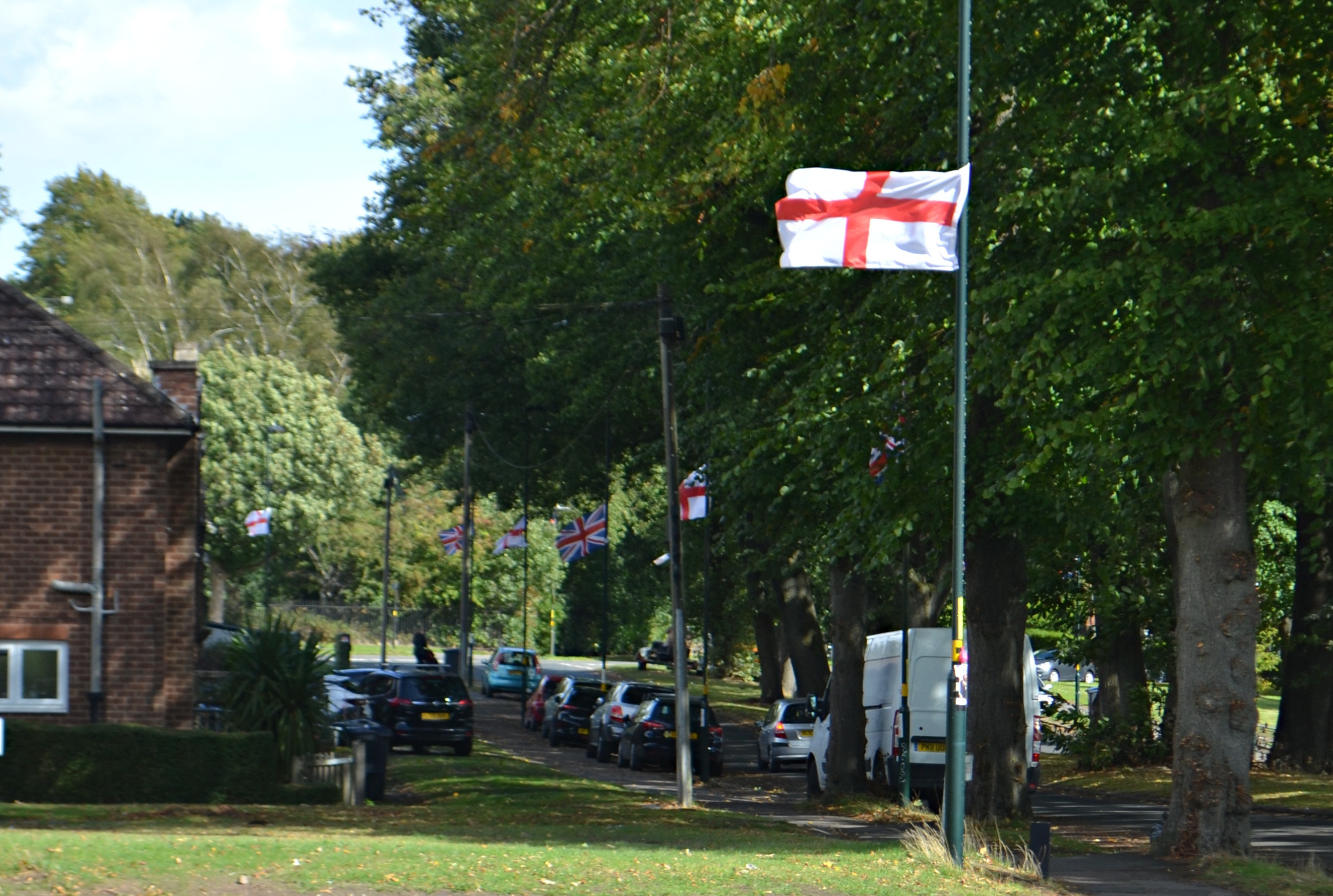 Weoley is, for starters, a largely unremarkable place. A hill-top village in Northeast Worcestershire that got subsumed by the grey mass of Birmingham and the Black Country in the 20th century to become one of countless suburban centres in the area. It is obscure even to Brummies at large, with Google Maps actually misplacing it when you search for it. The town has three real points of interest: the village green which acts as the focal point, with most of the shops facing onto it; the eponymous ruined castle to the north being the old seat of noble power made redundant by the industrialists and then being left to wrack & ruin; and finally the impressively large "Weoley Castle Pub" who's current festooning with flags gives it the aura of the likely house in which "operation flag" was first thought up. And my god are there a lot of flags. Every single lamppost in the district is flagged without exception; they line every street and cul-de-sac like they're hosting a royal parade. Yet more copies of St George's Cross are strung up in people's gardens, or hanging from windows, or even graffitied onto derelict brickwork. My first thought was one of recognition of the sheer effort put in here. While other examples I've seen around have been more haphazard and disorganised, in Weoley the totality was just impressive. There is something uniquely British about the exactitude on display here, a form of "almanacism". Every lamp-post in Weoley: no more and no less. The flags abruptly stop at the boundary of the next district, and along the primary boulevards Union Jacks and St George's Crosses take their orderly places in alternating fashion. An eye for detail one wouldn't generally associate with the genre of politics these people are likely from, but rather a village council aiming to win "Britain in Bloom". I've seen complaints (echoed by the BBC) that this is a symptom of our "Americanising culture", but this just isn't true. In America the stars and stripes are venerated, families ceremonial raise and lower their home's flag on a special flagpost, they don't ziptie them to lamposts every twenty feet. This is a British form of patriotic celebration, akin to hanging bunting or indeed like planting flower beds along the high street. Its much more like the (huge number) of national flags seen in the Nordic Countries like Norway, but that wouldn't make the point the BBC wants to make... These flags are apparently the sterling efforts of a group known as the "Weoley Warriors", a local faction describing themselves as: