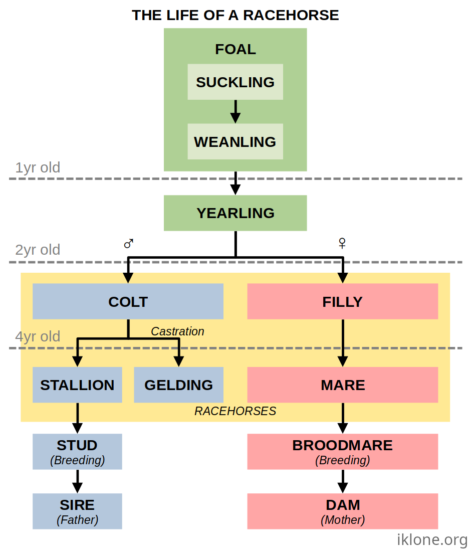Finally here are two diagrams I mocked up quickly to explain some terminology used when describing horses. Diagram A shows the different terms used for horses of different ages. A note to take is the absence of "pony". Pony is actually a term which refers to adults of horse breeds small in stature such as the Shetland Pony, and can't be used to refer to a young horse.