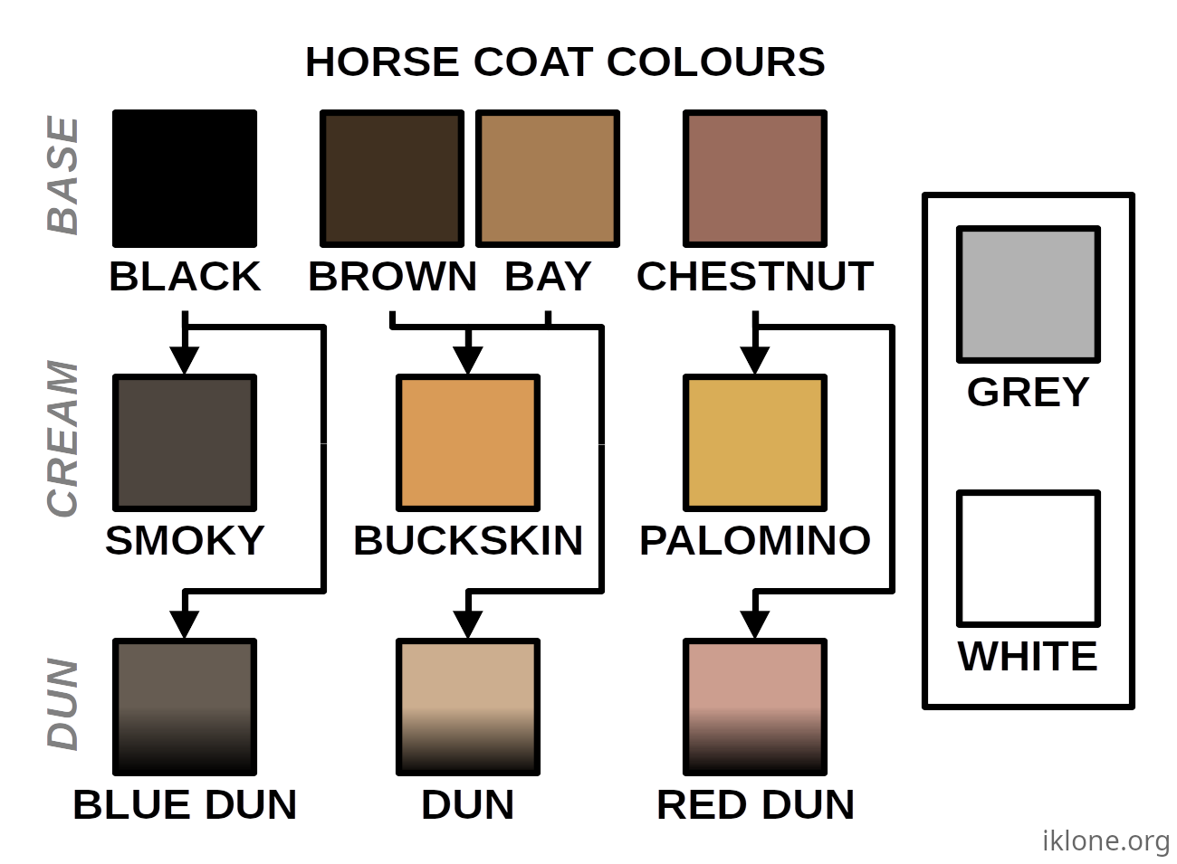 Dagram B is a colour swatch for the different horse-coat colours. Basically there are three base forms of horse colour: black, bay and chestnut. Bay and chestnut horses can be a wide range of lightness (with dark bay horses being called "brown"), the difference being that chestnut horses have a red aspect to their colour while bays do not. Grey horses are horses who have "greyed" like a human does in old age, and were originally a different colour: they can be light grey or white in colour. True white horses are very rare and are white from birth, they can be differentiated from grey horses by their pink skin underneath their coats (greys will have brown skin). There are also two genes which modify the base colours: the cream-gene and the dun-gene. Creamed horses (don't laugh) are generally lighter in colour and have a more "golden" look, they are mostly found in Spanish (and Mexican/Texan) horses. The dun-gene comes from indigenous European horses and lighten and dull the coat colour to give a "wild" look. The gene also makes the appendages of the horse (feet, tail, mane, face) very dark.