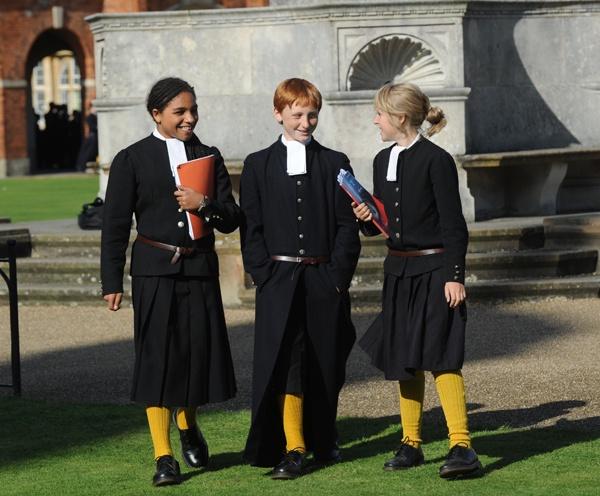 Like many of the greatest inventions of mankind, the school uniform had its oh-so humble beginnings on the island of Great Britain, particularly within the splendid walls of Christ's Hospital Public School in Sussex, 1552. Several decades prior King Henry VIII had dissolved the monasteries of England, and with them basically most of the schools as well, for they were all attached to a priory or the like. And so it came down to his son and heir King Edward VI to find a solution to this education gap: and thus the English Public School was born (for non-Brits a "public" school is actually a privately owned institution, not a state school). Most of these new schools were highly prestigious, such as Eton, Rugby or Winchester, but Christ's Hospital was a new egalitarian school of the renaissance, one where the lower classes would also have a shot at a decent education. And so, in order to make the poorer students stand out less and to equalise the playing field, standardised dress was introduced. This archo-school-uniform consisted of a blue great-coat, white necktie, and horrendously yellow knee-length woollen socks. And the amazing part is that this exact uniform is still worn at the school to this day!